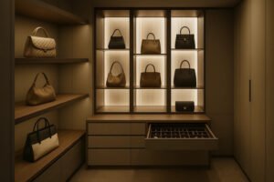 En los vestidores de lujo, el interior es igual de importante que la fachada. La armonía entre colores, materiales y texturas transmite coherencia y exclusividad.